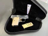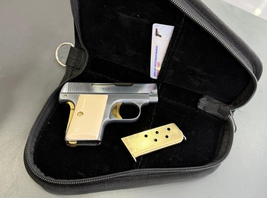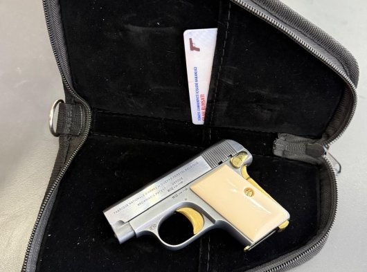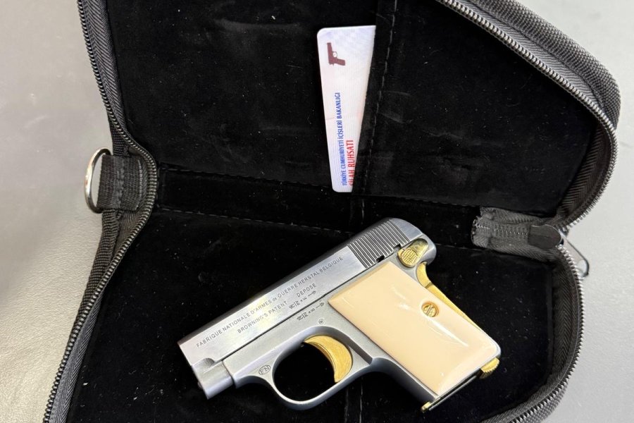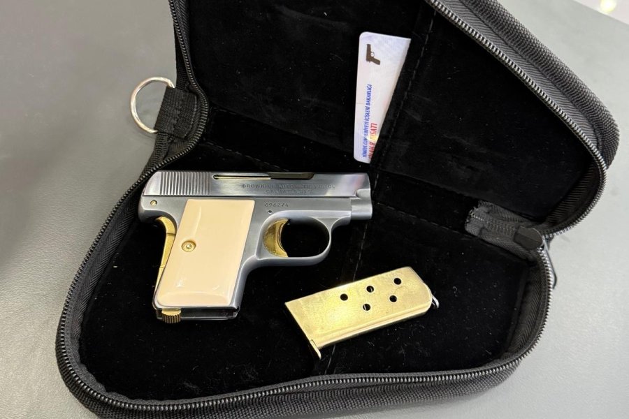 Browning 6.35 mermi çapı. Restorasyon yapılmış sarı titanyum kemik kabze. Gri titanyum kaplı.