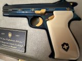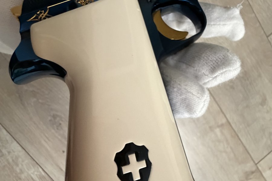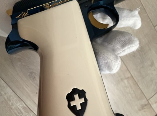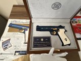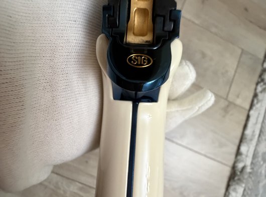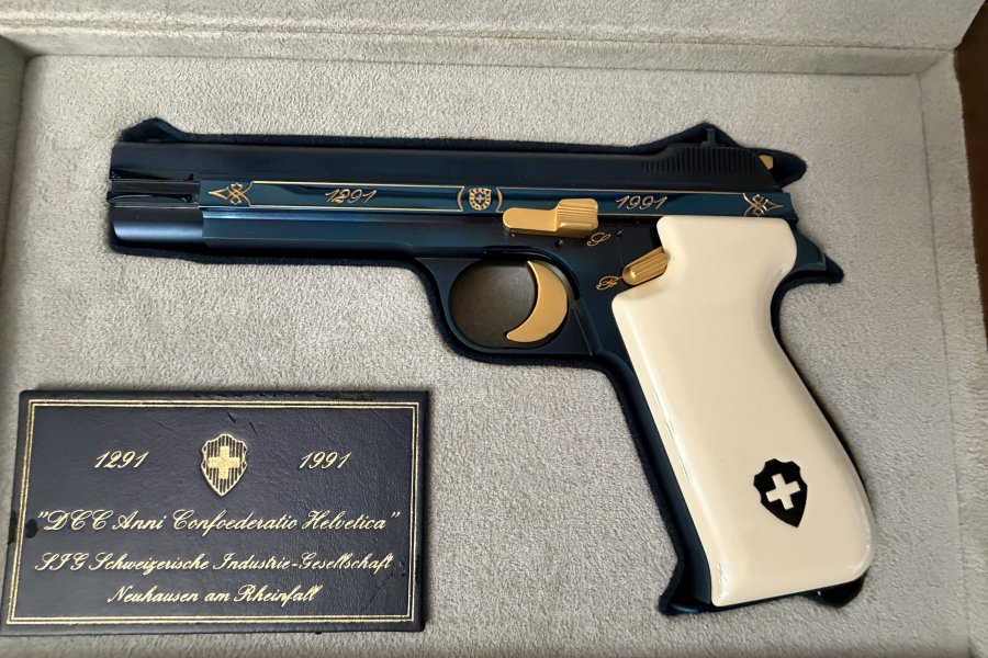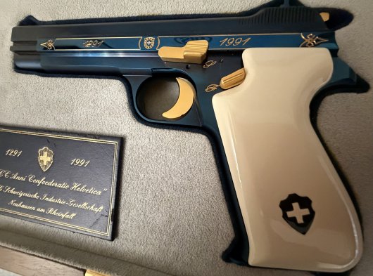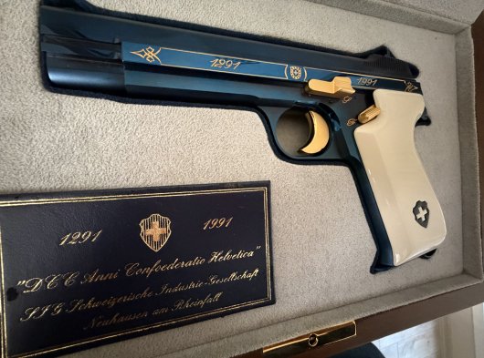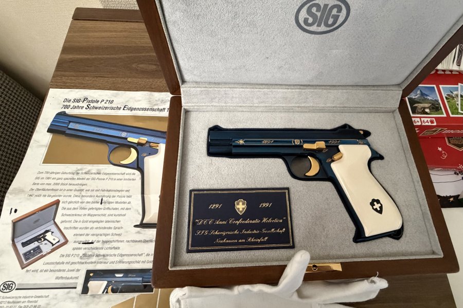 SIG BLUE P210 SIG firması ilk tabancasını 1291 yılında üretmiştir, 1991 de 700. yıl anısına, dünyaca ünlü İsviçre titanyum alaşımlı çeliğinden, orijinal parlak mavi renkte(boya değildir çelik belli bi sıcaklıkta tutulunca bu rengi almaktadır),kabzesi akçaağaçtan yapılıp özel bi boyayla fil dişine boyanmıştır, tetik, horoz, sürgü tutucu pimi ve üzerindeki işlemeleri altın kaplama, P 210 Confederetio Helvetica modelini, tüm dünyada sadece 2000 adet üretmiştir. Avrupadaki silah koleksiyoncularında bile nadiren bulunabilen çok özel bu koleksiyon silahı, 8+1 kapasiteli 9 mm. fişek atabilen, 125 mm. namlu uzunluğu ve 850 gr. ağırlığındadır.ilk 100 sıralama ve ilk 1000 sıralama içerisinde olanlarda kabze degisikligi mevcut olup İsviçre de ve Avrupa genelinde sınırlı sayıda kalmıştır .El değmemiş tetik dusurulmemis şarjör çıkartılmamistir .Kabzesi ve silah ilk günkü orjinalligini korumaktadır. Alıcısına hayırlı olsun